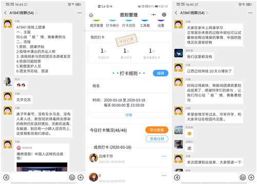 活动开始前,团支书组织班上同学签到,以确保全体同学都能参与本次活动。此次团课活动通过文字、语音、图片与视屏直播等交流形式。团支书首先向同学们概括了此次疫情的发展及影响,同时用实时数据变化加深了同学们对此次疫情严重性的认知;随后,从多个方面讲述了党和政府关于疫情防控的一系列重大决策部署,并向同学们介绍疫情中的杰出人物——钟南山院士、李兰娟院士、张定宇院长、李文亮医生等。在敬佩他们崇高的医德和对疫情防控做出的杰出贡献之余,同学们纷纷表示,作为新时代青年大学生,要以他们为榜样,努力学好专业知识,练就过硬本领,毕业后为人民群众服务,为实现中华民族伟大复兴的宏伟事业奉献出自己全部的力量。接着,参与了返乡大学生团员防疫志愿活动的同学纷纷发表了在防疫期间的经历与感想,也号召同学们要勇于承担“新时代青年的责任与使命”。为增强beat365团员青年对此次线上团课的参与度,个别班级进行了有关防疫问题的有奖问答活动,同学们踊跃参加,使大家的防疫知识得到提升。最后,全体团员青年对在一线奋战的医护工作者表示诚挚的感谢并致以崇高的敬意。