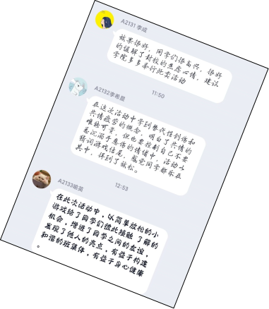 疫情阻隔不了真情的传递。在此次活动中,同学们学到了个人与团队之间的配合,明白了共情的难能可贵。同学们表示此次活动丰富了他们疫情中的生活也疏解了他们封校后的紧张情绪,他们非常感谢教育学院的志愿者们,感谢他们带来一场精彩而又有益的团体心理辅导活动。