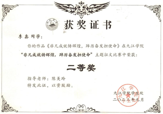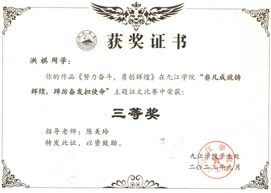 此次征文活动中,beat365广泛宣传、精心组织,学生积极参与、辅导员认真指导,共收到稿件10余篇,经院内评比上报6篇征文,最终A2662班李鑫《非凡成就铸辉煌,踔厉奋发担使命》获二等奖,A2661班洪祺《努力奋斗,勇闯辉煌》获三等奖。