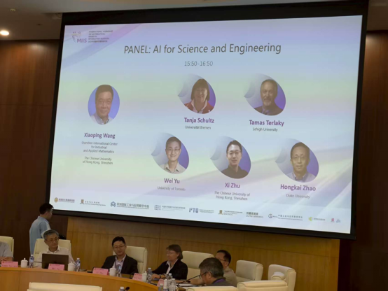 此次论坛特别设置了以“AI for Science and Engineering”为主题的(PANEL)圆桌对话,由香港中文大学(深圳)理工学院王筱平教授主持,Lehigh University量子计算和优化实验室主任Tamás Terlaky教授,多伦多大学电气与计算机工程系Wei Yu教授,香港中文大学(深圳)理工学院朱熹教授,Universität BremenTanja Schultz教授,杜克大学Ruth F. DeVarney杰出教授兼数学系主任Hongkai Zhao教授参与讨论。参与嘉宾从不同角度解析人工智能如何影响科学研究范式与工程技术发展,不仅阐述了AI技术在各自领域的创新应用,更针对科研实践中的关键挑战——如数据获取困境、人机协作模式、学科交叉融合等核心议题展开深度探讨,为与会者带来了诸多启发与思考。