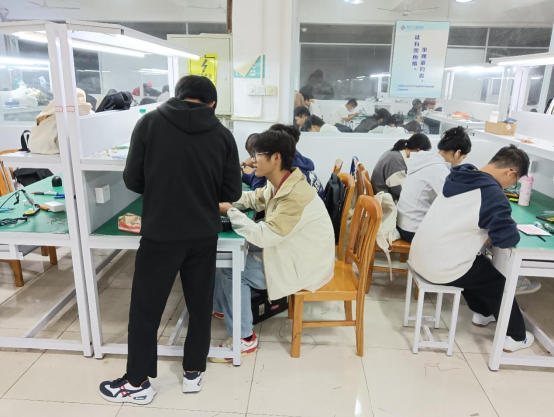理论学习结束后,培训进入实践焊接环节。实训教室内,300余名新生分为19个小组,分两批进行实践焊接,每组配备1名骨干成员提供指导。骨干们提前为每组准备了LM317芯片、电阻、电容、电路板等全套器材,并示范了电烙铁使用方法、焊接操作规范及安全注意事项。“焊接时温度要控制在300-350℃,焊点要圆润饱满,避免虚焊、漏焊。”骨干成员吴同学一边演示,一边提醒新生注意安全细节。新生们手持电烙铁,小心翼翼地进行元件焊接,遇到问题及时向骨干请教。对于焊接操作不熟练的新生,骨干们手把手指导,帮助他们掌握正确的焊接技巧。