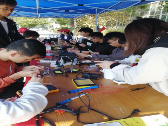 前期准备工作完成之后,上午9点,义务维修活动正式开始,各个成员开始了自己的工作,现场井然有序。志愿者负责接待前来维修的同学,登记维修物品的信息和发关于安全用电的传单。有很多同学都被我们的活动吸引,纷纷拿来自己需要修理的电器,饶有兴致地观看成员维修,并且发出惊叹觉得成员的操作很厉害。活动一直持续到下午四点,共维修了电脑、小冰箱、老式音箱、充电宝、吹风机、台灯、耳机等50多件电子产品。