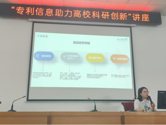 讲座伊始,常琰坤围绕专利信息的智能化运用展开系统讲解。借助incoPat科技创新情报平台,她详细介绍了查新检索的智能策略:AI检索可自动提取技术特征,精准剖析核心发明点,快速定位对比文件;语义检索则无需复杂检索式编写,通过自动解析技术描述文字,大幅提升检索效率。此外,平台支持一键导出多场景检索报告,显著优化科研工作效率。 随后,常琰坤结合高校科研特点,阐述了专利信息的战略价值。她指出,专利不仅是科研成果的法律保障,更是把握技术前沿、激发创新思路的重要资源。在高校科研追求原创突破的背景下,精准利用专利信息可有效避免重复研究,加速科研进程。