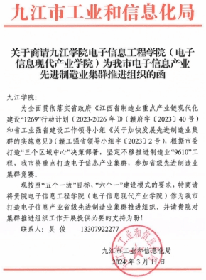 近日,我校电子信息产业学院与九江市工信局展开深度合作,共同推进省政府《江西省制造业重点产业链现代化建设“1269”行动计划(2023-2026年)》及九江市委“9610”工程的实施,为九江市参加省级先进制造业集群竞赛活动提供全方位的智力支持。